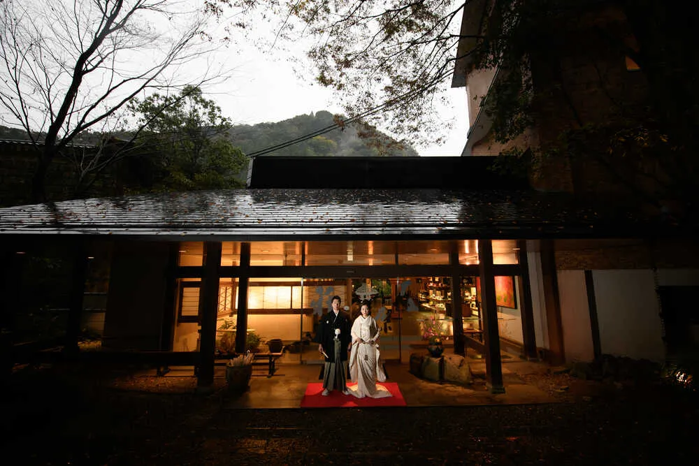 温泉旅館のバーやラウンジまで館内をフル活用し、二次会まで同じ場所で完結します。友人カメラマンによる撮影や衣装・ヘアメイクの持ち込みにも対応可能です。