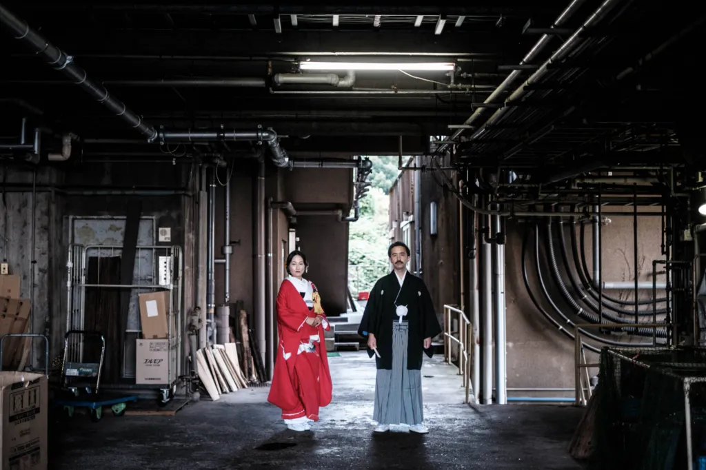 石川県出身の二人。地元山代温泉で町の電気屋さんを営む新郎家。もともと温泉が好きだった二人は、お仕事柄
