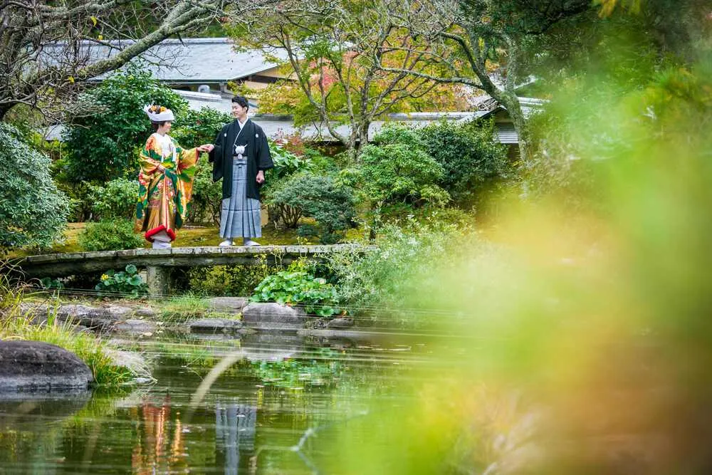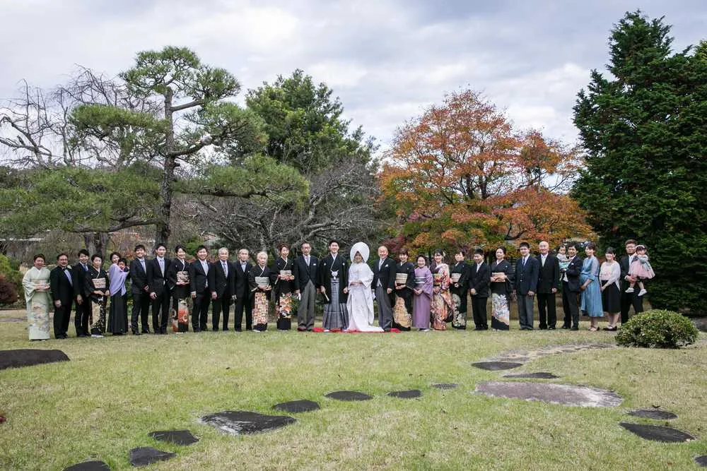 和装での神前挙式からはじまり、紅葉の美しい庭園でのロケーション撮影。ウエディングドレスで父とウエディングロードを歩き夢を叶えたふたり。披露宴はゲストとの食事と会話が中心のゆったりした時間。各部屋ごとに深夜まで語り合い、大浴場で裸の付き合いを深めた。